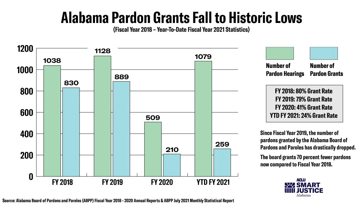 Earlier this year, ACLU of Alabama’s Campaign for Smart Justice reported on the precipitous drop in pardon grants under the current board, led by former prosecutor Leigh Gwathney. According to the latest data available on the ABPP website, the board has denied 76 percent of pardon applicants in FY 2021.